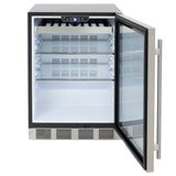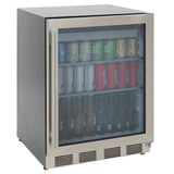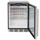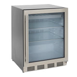 Keep bottles and cans chilled to perfection with the Maxximum 24" Indoor Beverage Center. With a capacity of 5.5 cubic feet, this beverage cooler refrigerator holds 173 12-ounce cans, 94 12-ounce bottles or 8 750mL wine bottles. The sleek wine and beverage cooler refrigerator features a matte black painted cabinet exterior with a white interior. It has a user-friendly electronic control with LED display. The unit's temperature range is 34°F to 65°F, and the fan-assisted cooling system allows for even temperatures, quicker cooldown times and added efficiency. The unit has an adaptable racking system that includes 1 stainless front, full-extension wine bottle rack with 2 tempered glass adjustable shelves. Tri-Color (White/Amber/Blue) LED lighting options illuminate the contents when the door is open or shut with display/showcase mode enabled. The unit ships right-hinged with a field-reversible door and includes a 3/4" diameter vertical stainless-steel handle. The door close assist hinge helps ensure door closure, while the four leveling legs help stabilize the unit. Precise zero clearance design allows for unmatched integration into any built-in setting, and it's perfect for any indoor space. Fill the Maxximum 24" Indoor Beverage Center with your favorite canned and bottled beverages for a refreshing drink anytime. The parts and onsite labor warranty comes standard for one year from date of purchase, so all that is left to do is sit back and enjoy your cold canned or bottled drinks. *Item not approved for sale in California